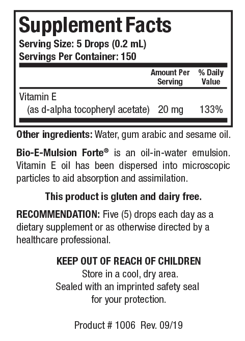 Bio-E-Mulsion Forte® suministra vitamina E en forma líquida, emulsionada para ayudar con la absorción y asimilación, lo cual es especialmente importante para aquellos con problemas de malabsorción. Cada gota proporciona 6 UI de vitamina E como acetato de d-alfa tocoferilo (vitamina E natural).