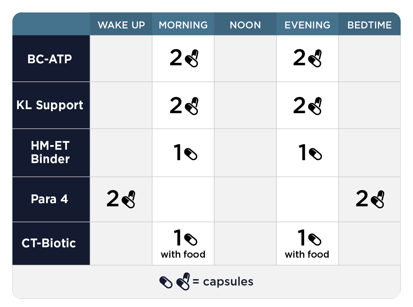 Los pacientes continuarán tomando BC-ATP y KL Support en esta fase para optimizar su salud mitocondrial y sus niveles de energía, así como para respaldar vías de drenaje saludables.*