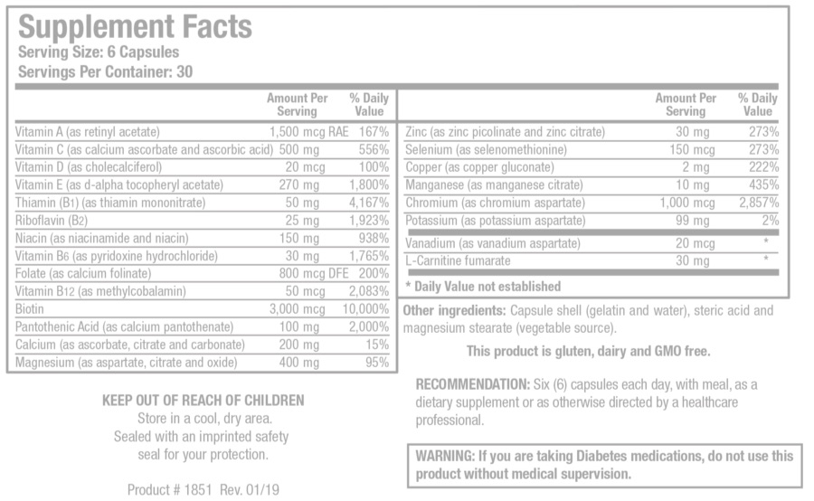 Vitamina A (como acetato de retinilo), vitamina C (como ascorbato de calcio y ácido ascórbico), vitamina D (como colecalciferol), vitamina E (como acetato de d-alfa tocoferilo), tiamina (B1) (como mononitrato de tiamina), riboflavina (B2 ), Niacina (como niacinamida y niacina), vitamina B6 (como hidrocloruro de piridoxina), folato (como folinato cálcico), vitamina B12 (como metilcobalamina), biotina, ácido pantoténico (como pantotenato cálcico), calcio (como ascorbato, citrato y carbonato ), Magnesio (como aspartato, citrato y óxido), zinc (como picolinato de zinc y citrato de zinc), selenio (como selenometionina), cobre (como gluconato de cobre), manganeso (como citrato de manganeso), cromo (como aspartato de cromo), potasio (como aspartato de potasio), vanadio (como aspartato de vanadio), fumarato de L-carnitina
