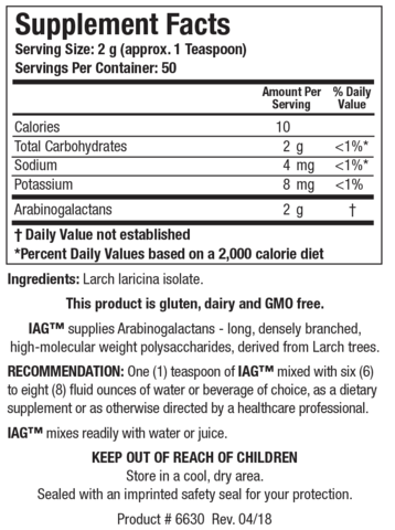 DescripciónIAG ™ proporciona arabinogalactanos, derivados del alerce. Los arabinogalactanos son polisacáridos largos, densamente ramificados y de alto peso molecular, que actúan como activadores naturales de la vía del complemento del sistema inmunológico. La vía del complemento es responsable de los mecanismos de defensa no específicos del huésped. Los estudios también han documentado la capacidad del arabinogalactano para mejorar la citotoxicidad de las células asesinas naturales. Además del apoyo inmunológico, el IAG también se considera un prebiótico, ya que es capaz de apoyar el crecimiento de bacterias beneficiosas.