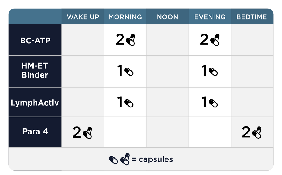 El Paso 4 continúa donde lo dejó el Paso 3 para continuar promoviendo la desintoxicación sistémica y vías de drenaje saludables con BC-ATP, HM-ET Binder, LymphActiv y Para 4.* BC-ATP regresa para optimizar la producción de energía y la salud mitocondrial, mientras que el otro tres productos se introducen en el protocolo por primera vez.*