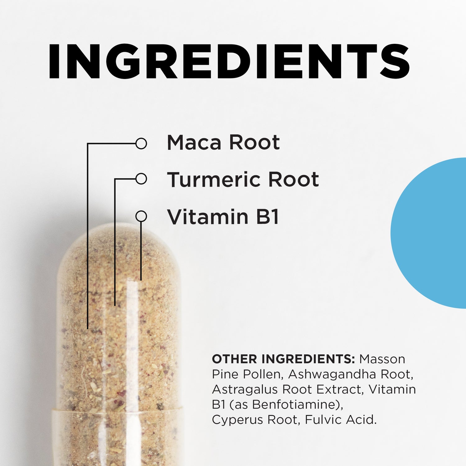 S-TRO contiene una mezcla patentada de hierbas adaptogénicas, que incluye raíz de ashwagandha, extracto de raíz de astrágalo, raíz de maca, polen de pino Masson y raíz de cúrcuma, para respaldar niveles saludables de estrógeno y testosterona tanto en hombres como en mujeres.*